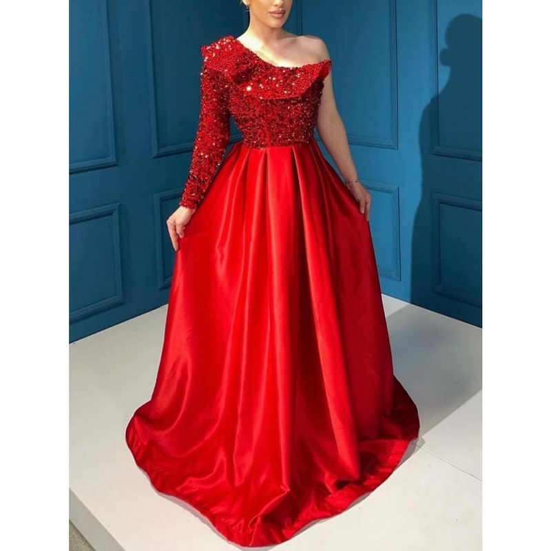 A-Line Evening Gown Party Dress Formal Sweep / Brush Train Christmas Red Green Dress Long Sleeve One Shoulder Sequined with Glitter Pleats Ruffles
