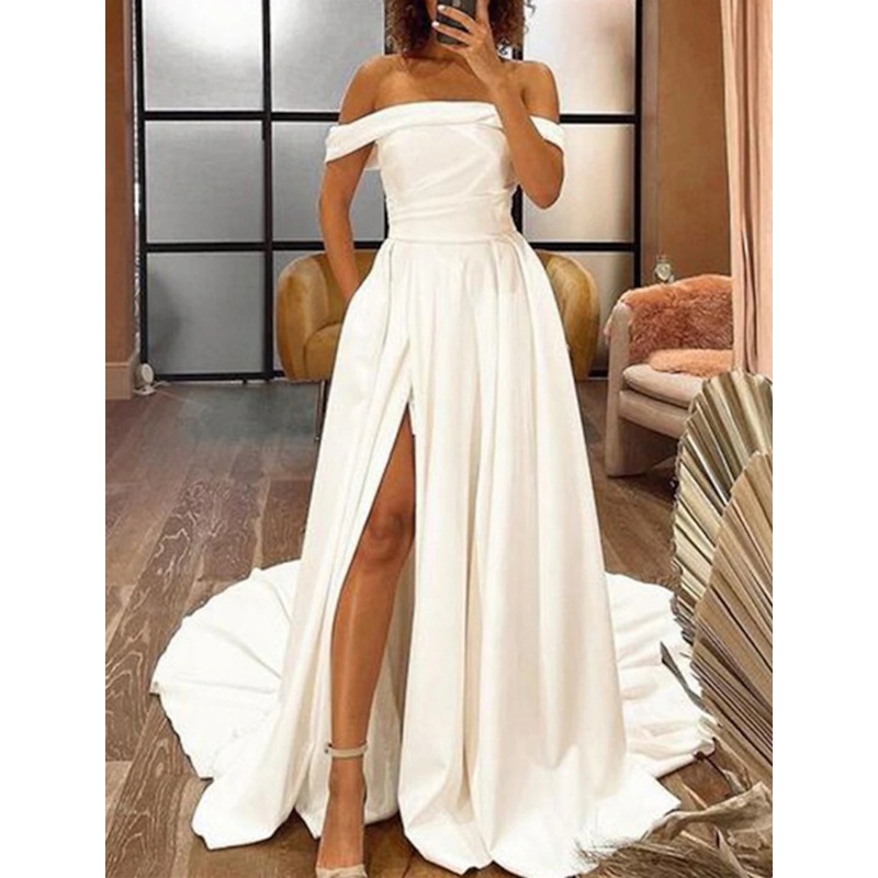 A-Line Evening Gown Party Dress Wedding Prom Court Train Sleeveless Off Shoulder Pocket Satin with Ruched Slit
