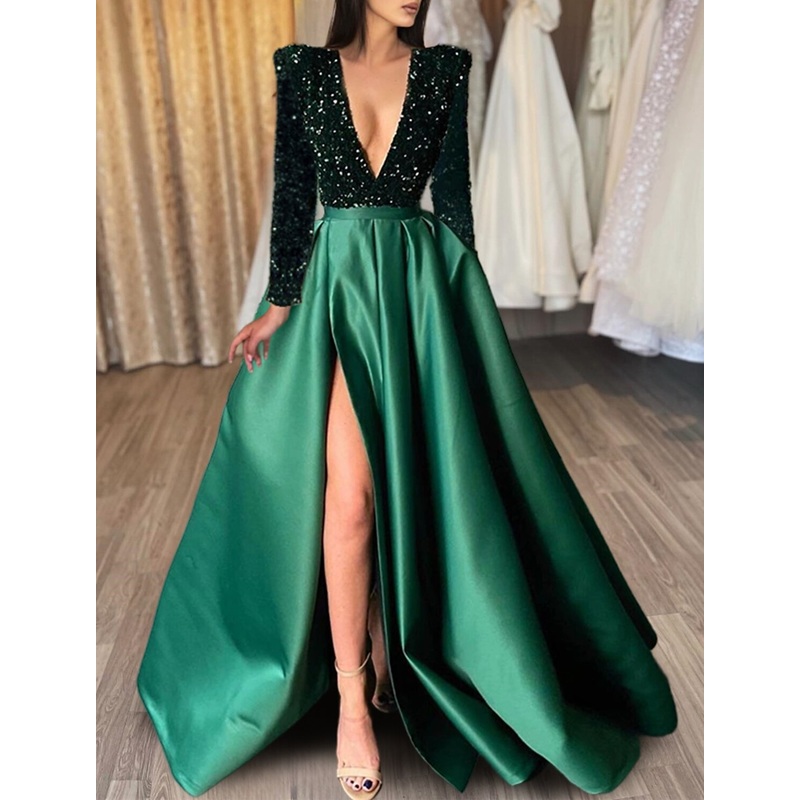 Be the first to review “A-Line Evening Gown Red Green Dress Formal Black Dress Plus Size Wedding Court Train Half Sleeve V Neck Satin with Sequin Slit”