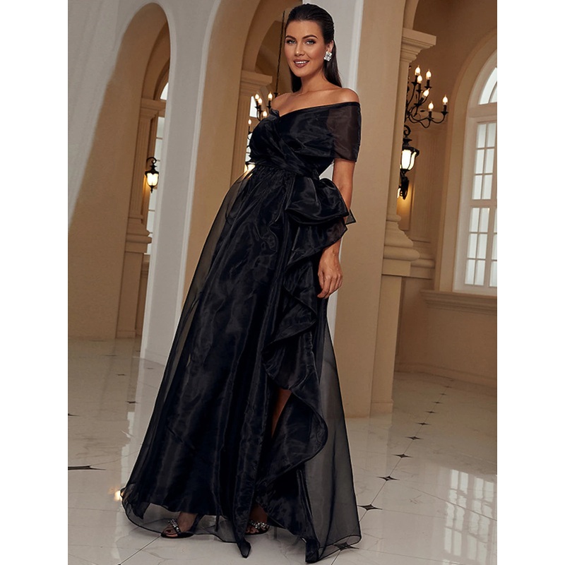 A-Line Evening Gown Sexy Dress Formal Wedding Guest Floor Length Short Sleeve Off Shoulder Wednesday Addams Family Polyester with Ruffles Slit