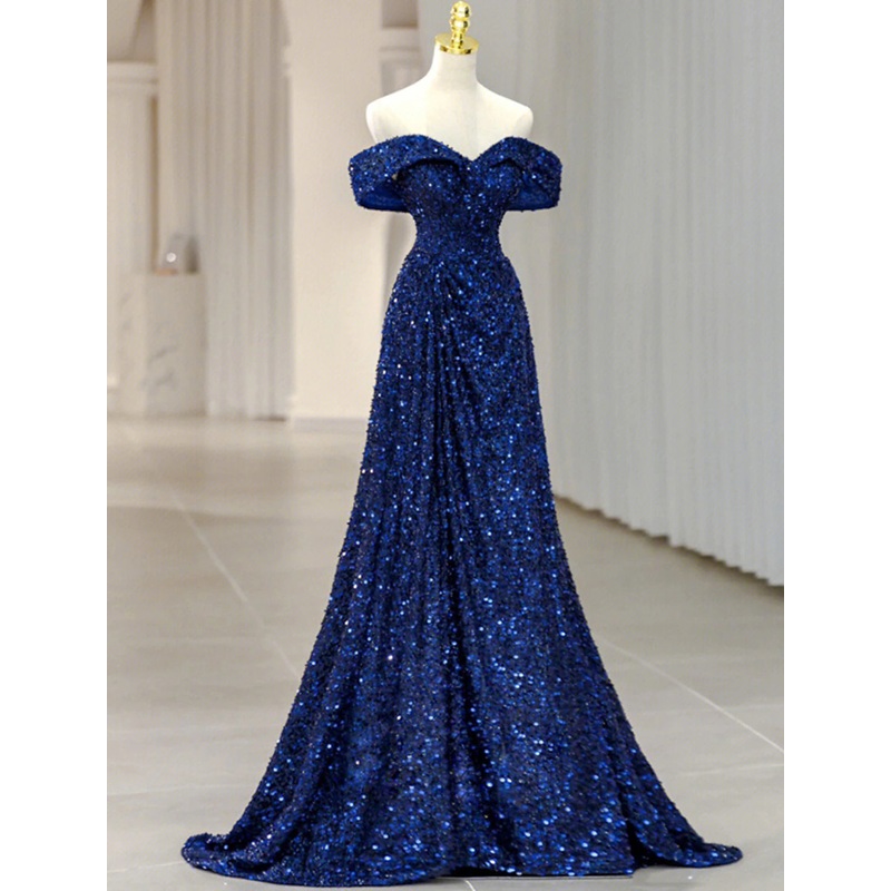 A-Line Evening Gown Sparkle & Shine Dress Formal Wedding Guest Sweep / Brush Train Sleeveless Off Shoulder Sequined with Glitter Sequin