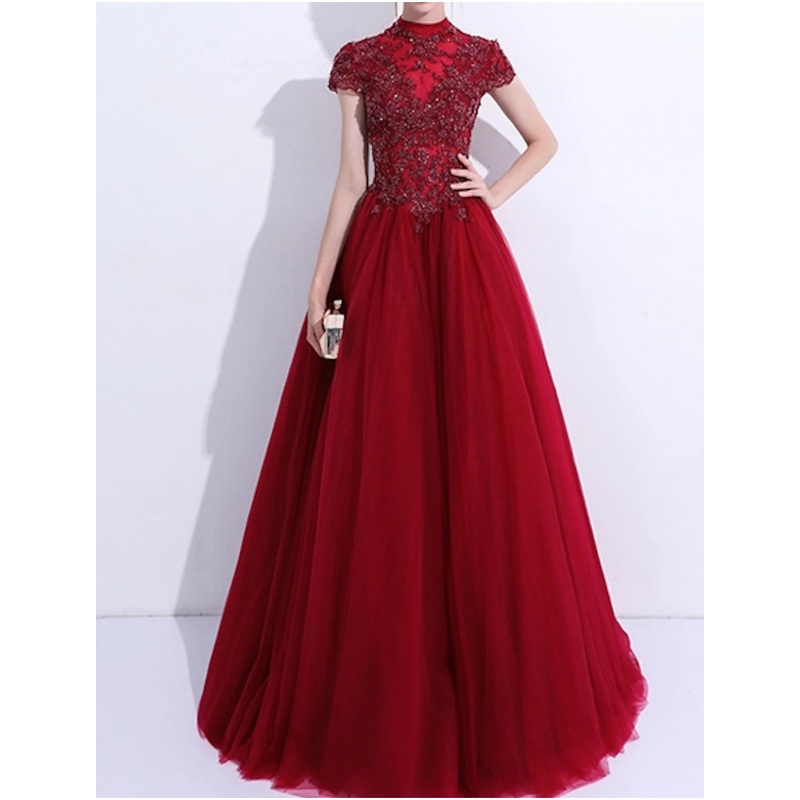 A-Line Evening Gown Vintage Dress Quinceanera Wedding Guest Floor Length Short Sleeve High Neck Tulle with Pleats Appliques 2025