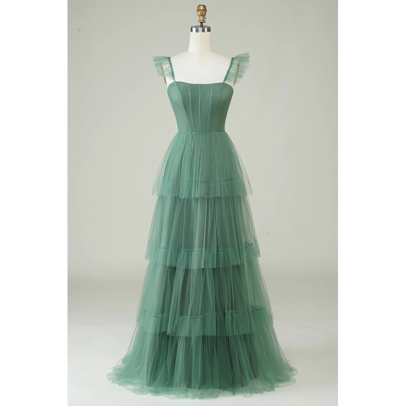 A Line Fine Shoulder Strap Long Thin Gauze Eucalyptus Bridesmaid Dress