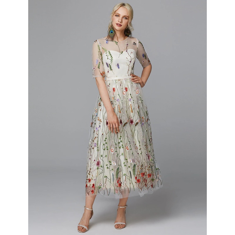 A-Line Floral Dress Valentine's Day Wedding Guest Tea Length Half Sleeve Illusion Neck Lace with Embroidery Appliques