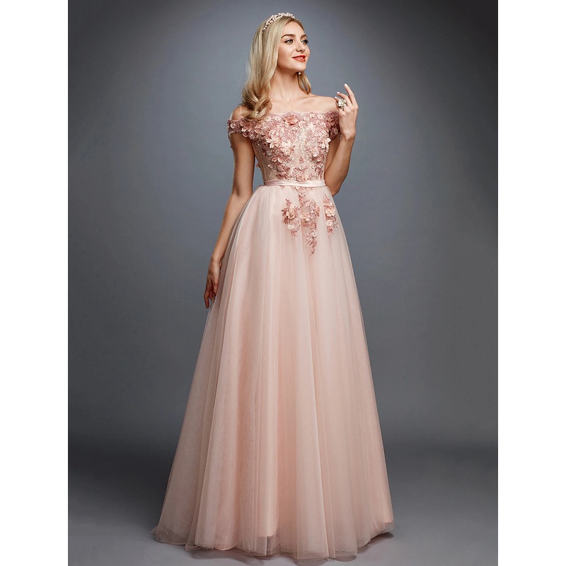 Be the first to review “A-Line Floral Dress Wedding Guest Prom Sweep / Brush Train Sleeveless Off Shoulder Tulle Over Lace with Appliques” Cancel reply