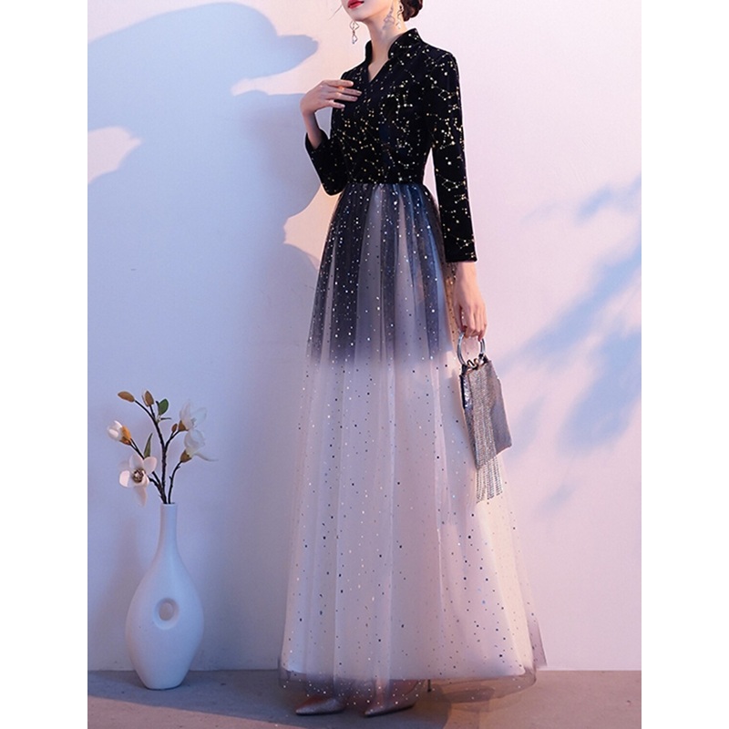 A-Line Glittering Elegant Prom Formal Evening Dress Queen Anne Long Sleeve Floor Length Tulle with Sequin 2025