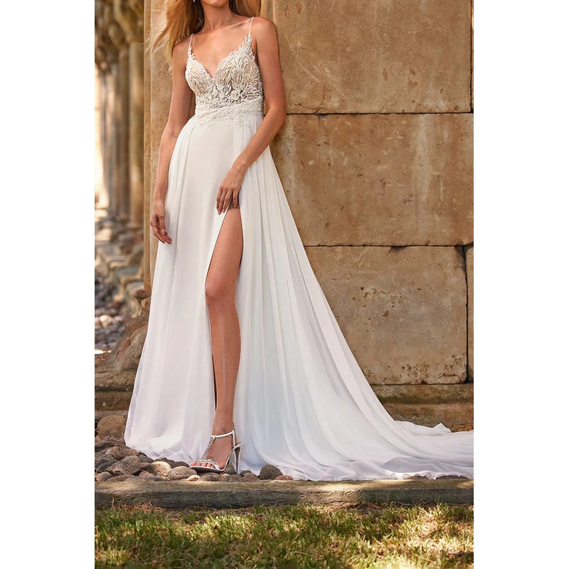 A-line illusion V-neck lace decal bohemian style slit wedding dress