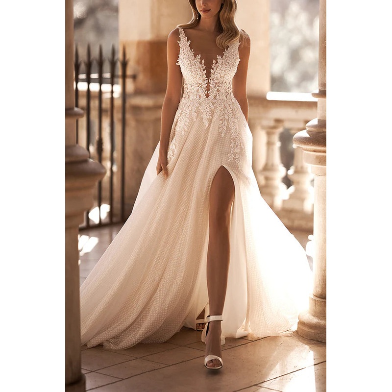A-line illusion V-neck lace sticker rural style slit wedding dress
