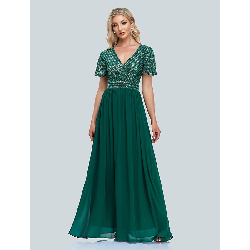 A-Line Mermaid Party Dress Evening Gown Sparkle & Shine Dress Christmas Wedding Guest Floor Length Short Sleeve V Neck Sequined with Sequin