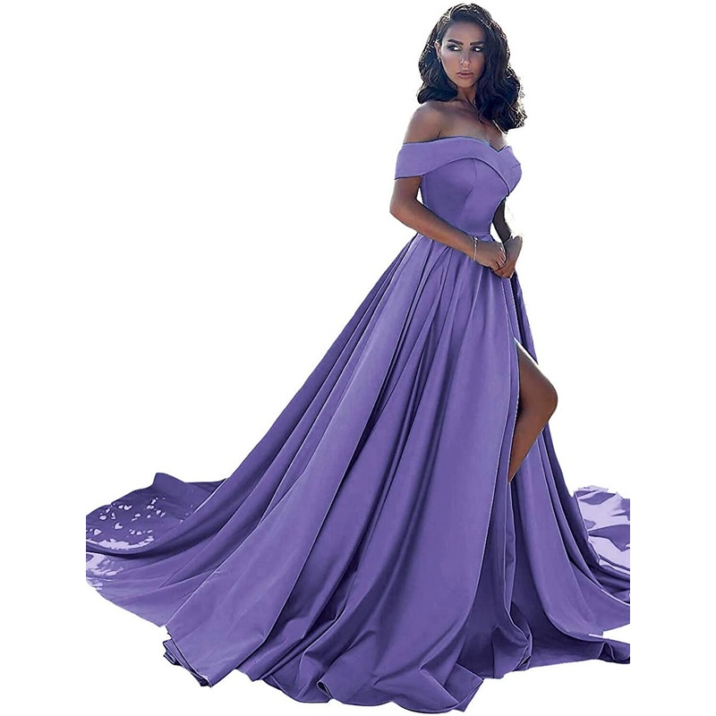 A-Line Minimalist Sexy Prom Formal Evening Dress Off Shoulder Sleeveless Chapel Train Satin with Split Front