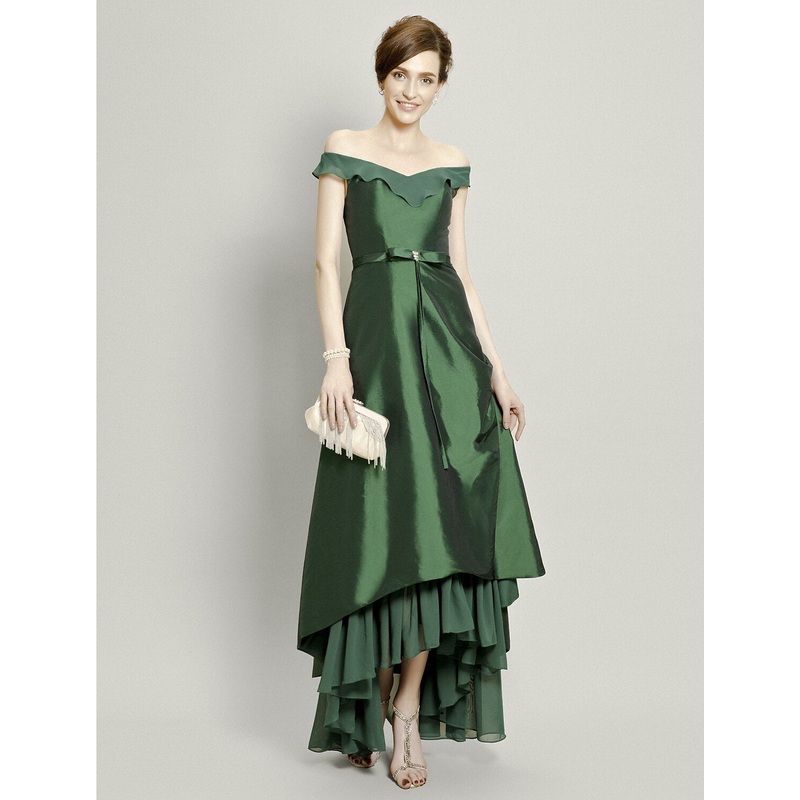 A-Line Mother of the Bride Dress Elegant High Low Off Shoulder Asymmetrical Chiffon Taffeta Short Sleeve with Pick Up Skirt Bow(s) Beading