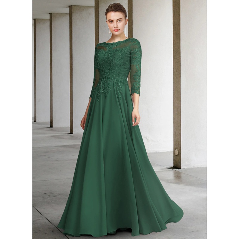 A-Line Mother of the Bride Dress Elegant Jewel Neck Floor Length Chiffon Lace 3/4 Length Sleeve with Pleats Appliques