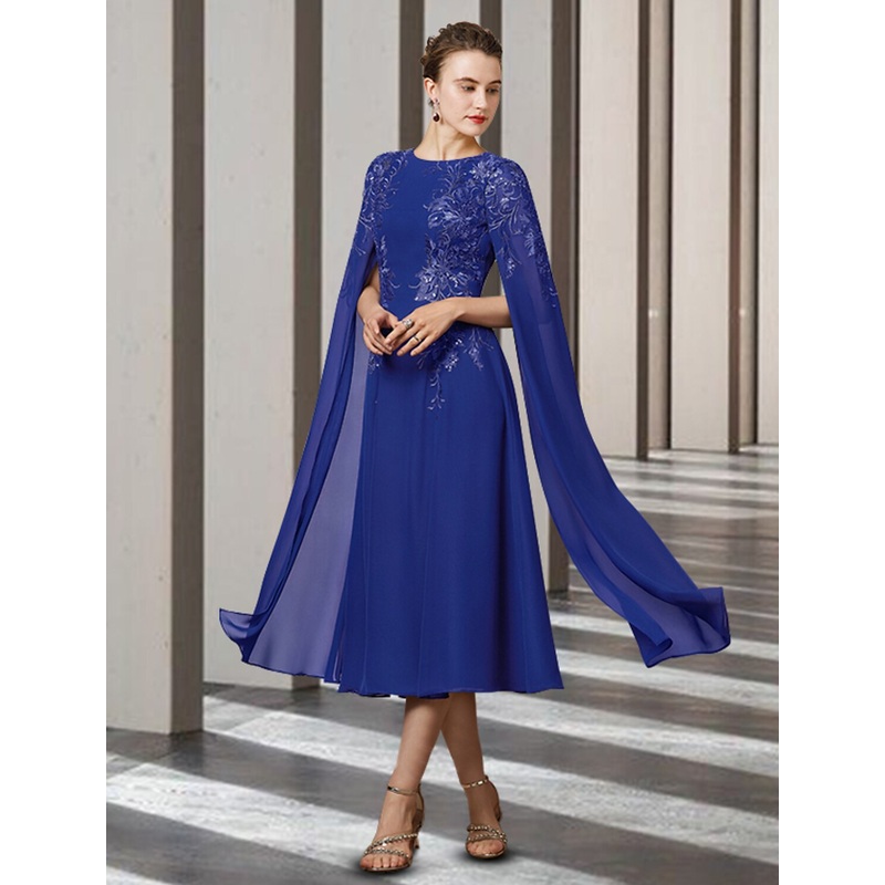 A-Line Mother of the Bride Dress Elegant Jewel Neck Tea Length Chiffon Lace Sleeveless with Appliques