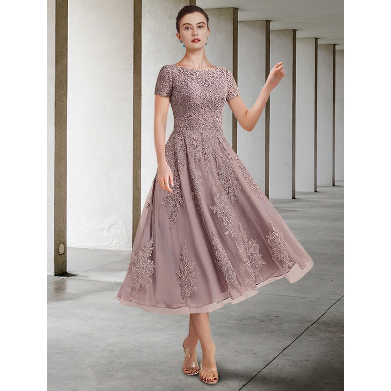 A-Line Mother of the Bride Dress Elegant Jewel Neck Tea Length Lace Tulle Short Sleeve with Appliques