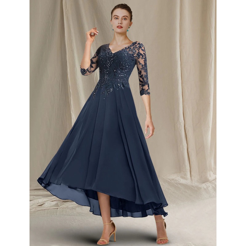 A-Line Mother of the Bride Dress Elegant Sparkle & Shine High Low V Neck Asymmetrical Tea Length Chiffon Lace Half Sleeve with Sequin Ruffles Appliques