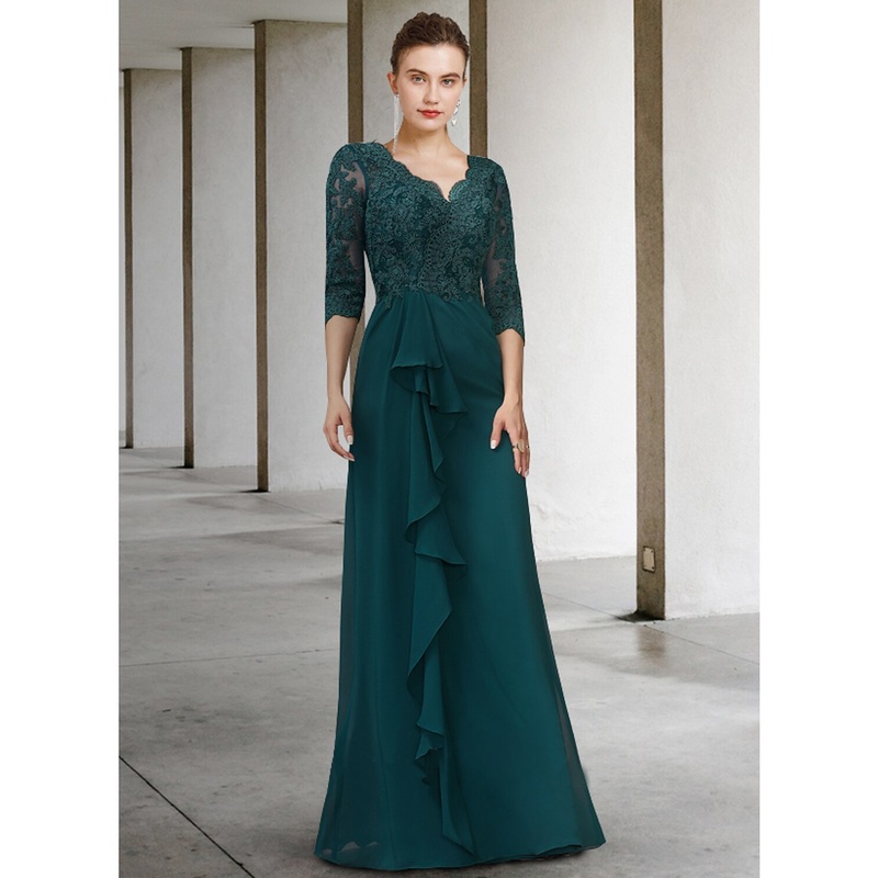 A-Line Mother of the Bride Dress Elegant V Neck Floor Length Chiffon Lace Half Sleeve with Draping Appliques
