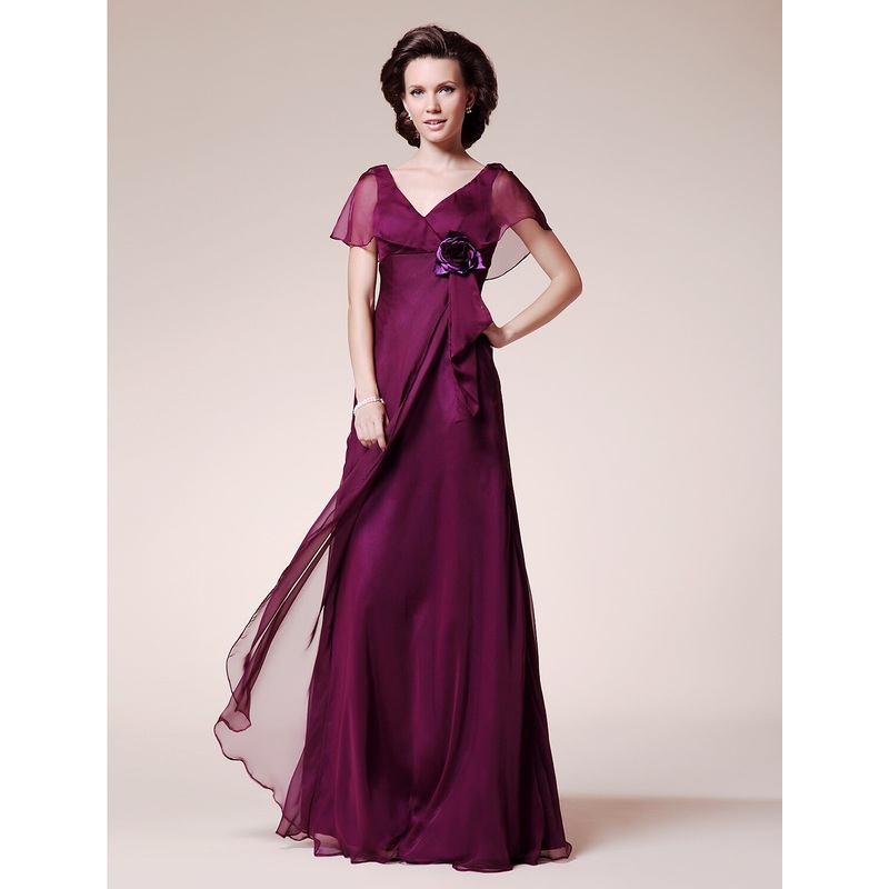 A-Line Mother of the Bride Dress Elegant V Neck Floor Length Chiffon Short Sleeve No with Ruffles Flower