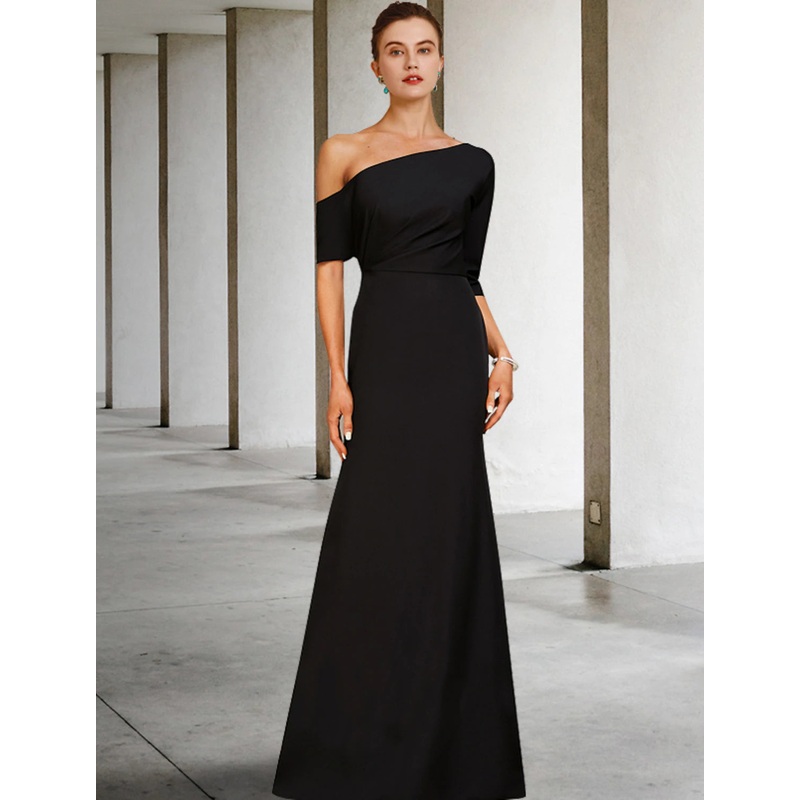 A-Line Mother of the Bride Dress Fall Wedding Guest Vintage Elegant One Shoulder Floor Length Charmeuse 3/4 Length Sleeve with Ruffles Side-Draped