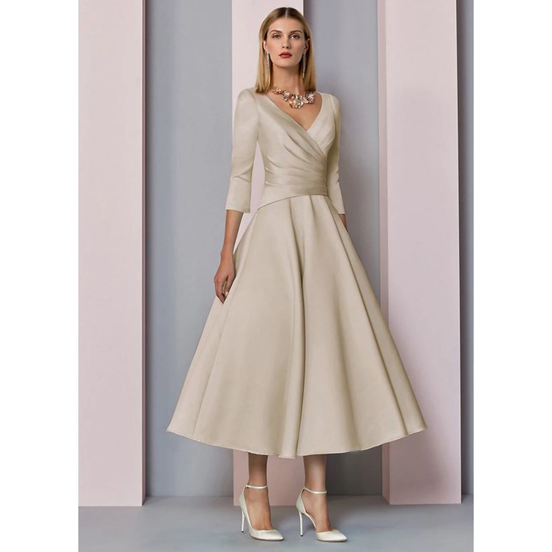 A-Line Mother of the Bride Dress Fall Wedding Guest Vintage Plus Size Elegant V Neck Tea Length Satin 3/4 Length Sleeve with Pleats