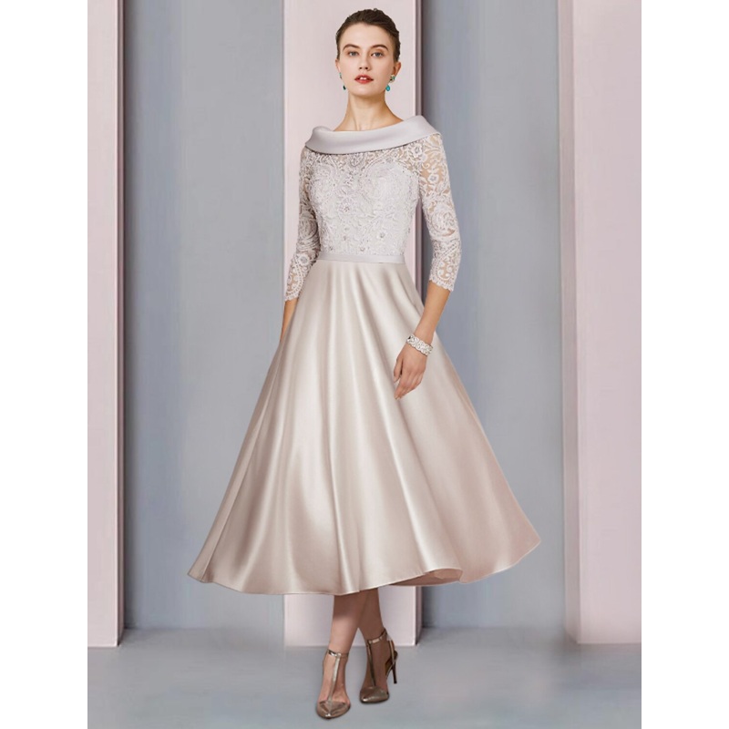 A-Line Mother of the Bride Dress Formal Church Party Elegant Cowl Neck Tea Length Satin Lace 3/4 Length Sleeve with Beading Appliques