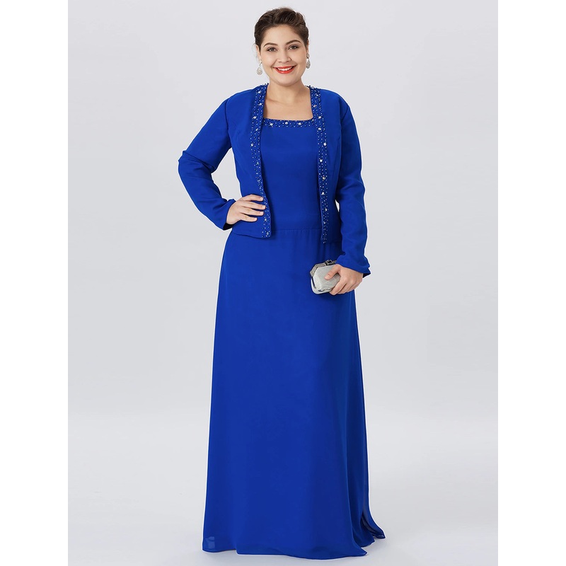 A-Line Mother of the Bride Dress Formal Classic & Timeless Elegant & Luxurious Plus Size Straps Floor Length Chiffon Lace Long Sleeve Wrap Included with Pearls Crystals