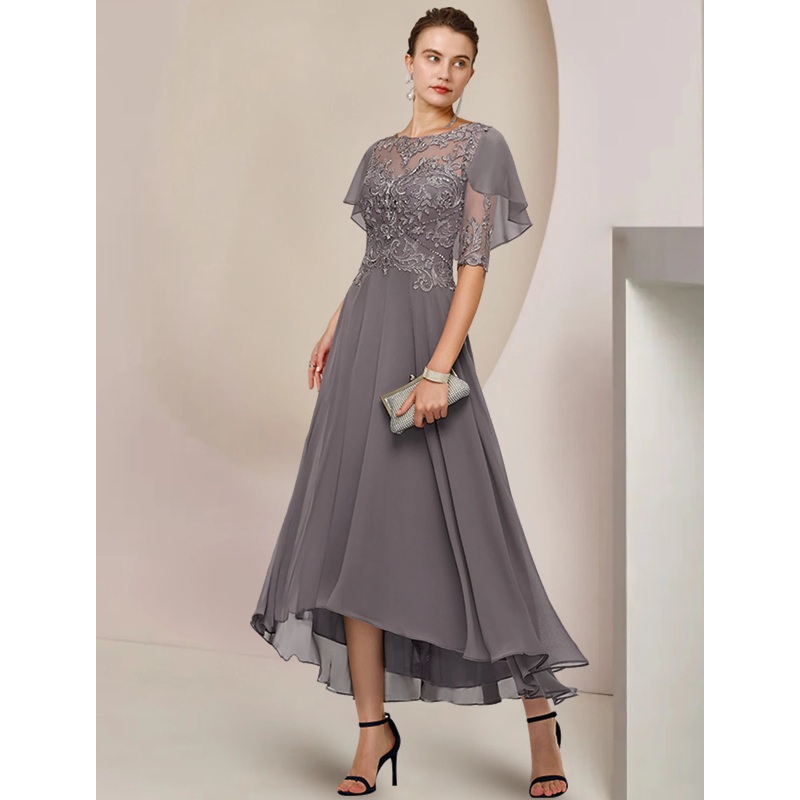 A-Line Mother of the Bride Dress Formal Fall Wedding Guest Elegant Scoop Neck Asymmetrical Tea Length Chiffon Lace Half Sleeve with Beading Appliques