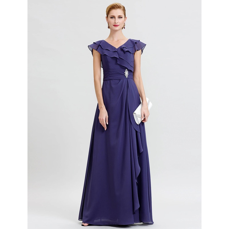 A-Line Mother of the Bride Dress Formal Open Back Elegant V Neck Floor Length Chiffon Short Sleeve No with Sash / Ribbon Crystal Brooch