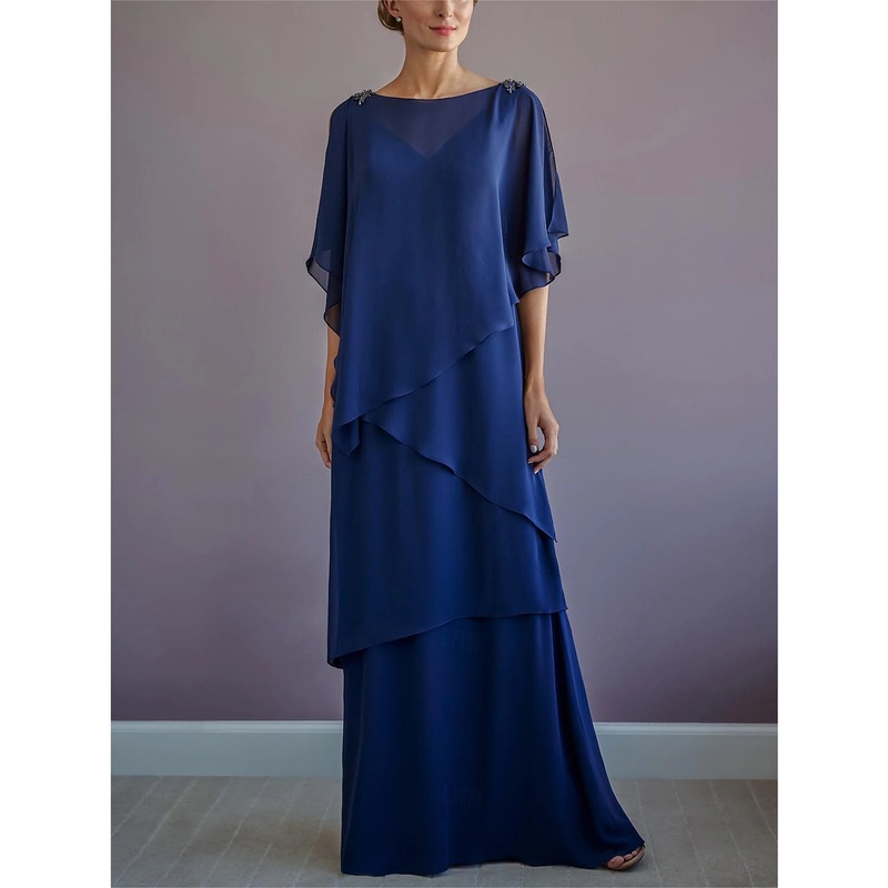 A-Line Mother of the Bride Dress Formal Wedding Guest Elegant Bateau Neck Floor Length Chiffon Half Sleeve with Ruffles Draping Tier