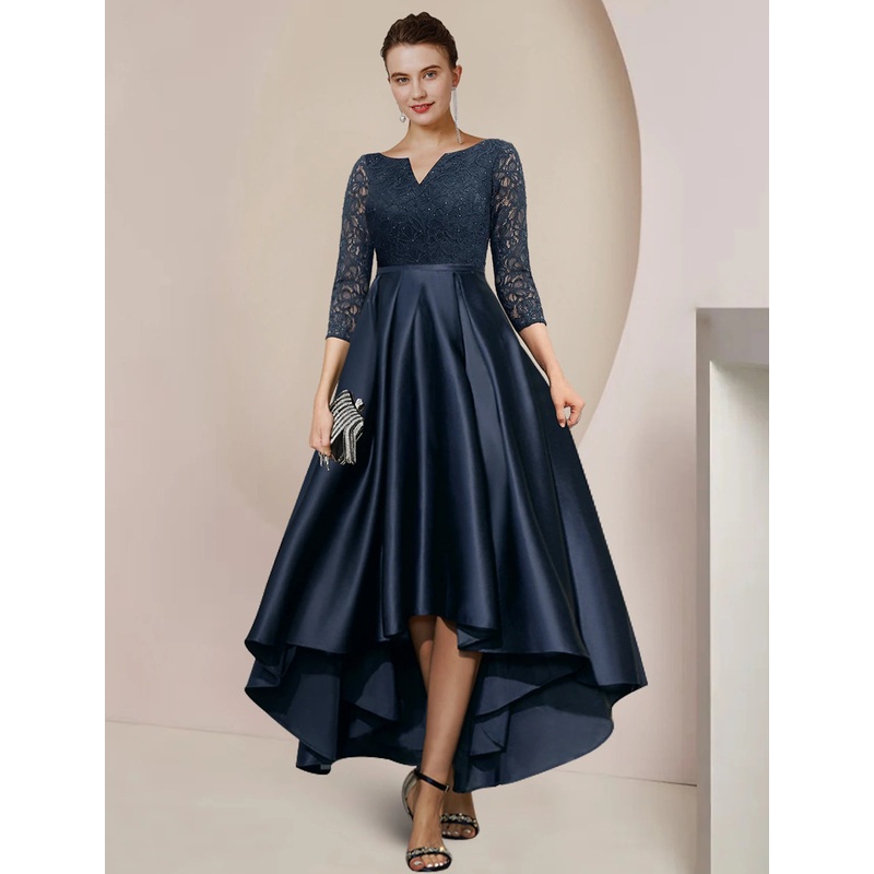 A-Line Mother of the Bride Dress Formal Wedding Guest Elegant High Low Scoop Neck Asymmetrical Tea Length Satin Lace 3/4 Length Sleeve with Pleats Beading