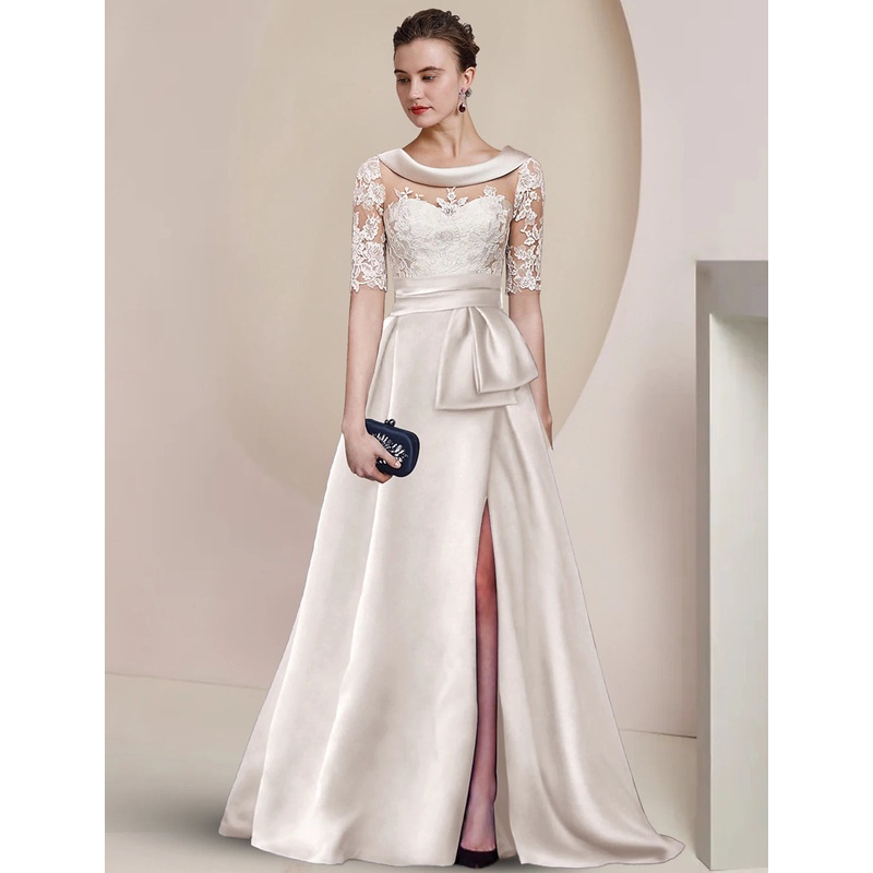 Be the first to review “A-Line Mother of the Bride Dress Formal Wedding Guest Elegant Scoop Neck Sweep / Brush Train Satin Lace Half Sleeve with Ruched Appliques”