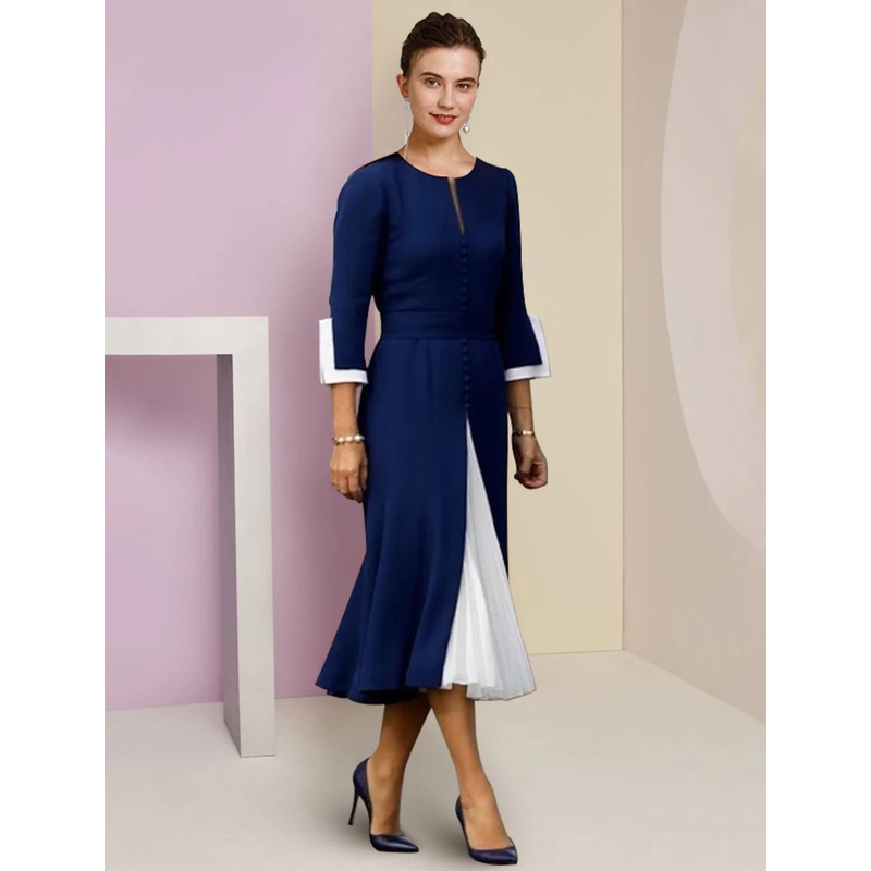 A-Line Mother of the Bride Dress Formal Wedding Guest Elegant Scoop Neck Tea Length Chiffon 3/4 Length Sleeve with Buttons Color Block