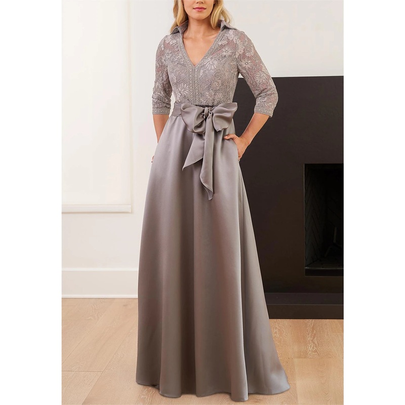 A-Line Mother of the Bride Dress Formal Wedding Guest Elegant Shirt Collar Floor Length Lace Sequined Italy Satin 3/4 Length Sleeve with Sash / Ribbon Bow(s) Sequin