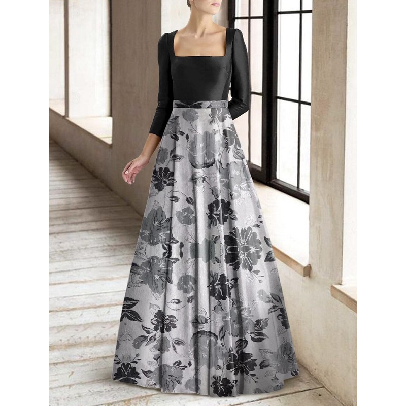 A-Line Mother of the Bride Dress Formal Wedding Guest Elegant Square Neck Floor Length Taffeta Fabric 3/4 Length Sleeve with Pleats Flower