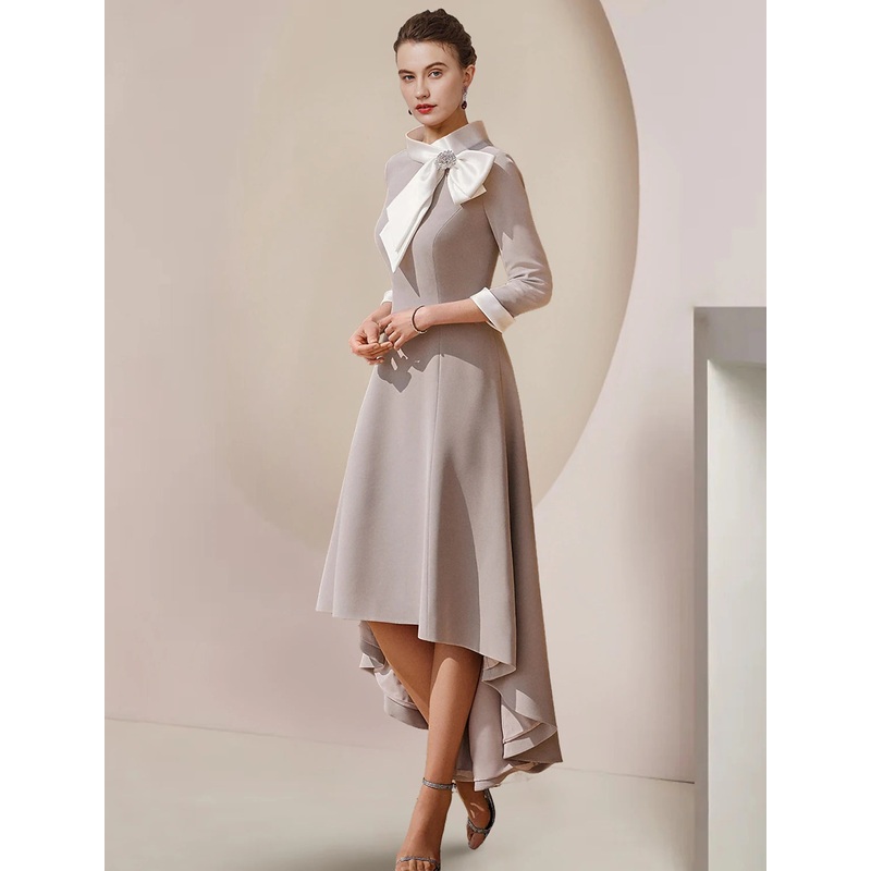 A-Line Mother of the Bride Dress Formal Wedding Guest Party Elegant High Neck Asymmetrical Tea Length Satin 3/4 Length Sleeve with Bow(s) Crystal Brooch