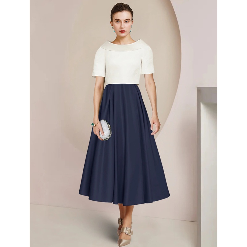 A-Line Mother of the Bride Dress Formal Wedding Guest Party Elegant Scoop Neck Tea Length Satin Short Sleeve with Pleats Color Block