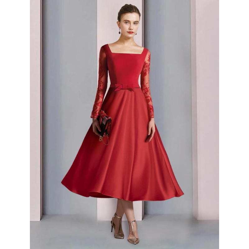 A-Line Mother of the Bride Dress Formal Wedding Guest Vintage Elegant Square Neck Tea Length Satin Lace Fabric Long Sleeve with Bow(s) Appliques
