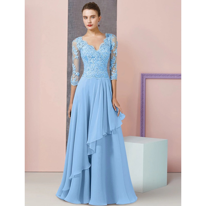 A-Line Mother of the Bride Dress Formal Wedding Guest Vintage Elegant V Neck Floor Length Chiffon Lace Half Sleeve with Beading Sequin Appliques