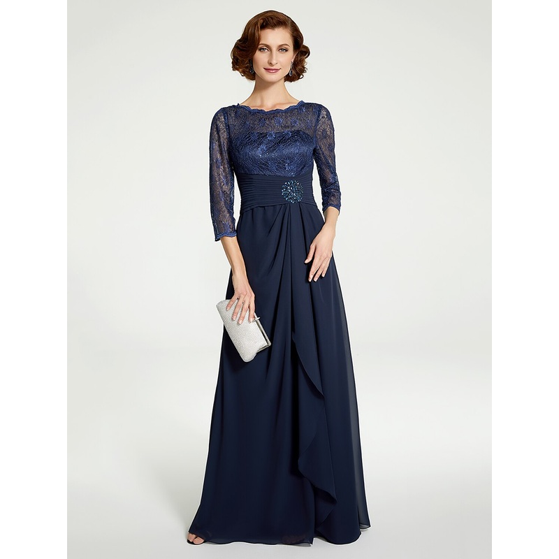 A-Line Mother of the Bride Dress Jewel Neck Floor Length Chiffon Lace 3/4 Length Sleeve with Lace Ruching