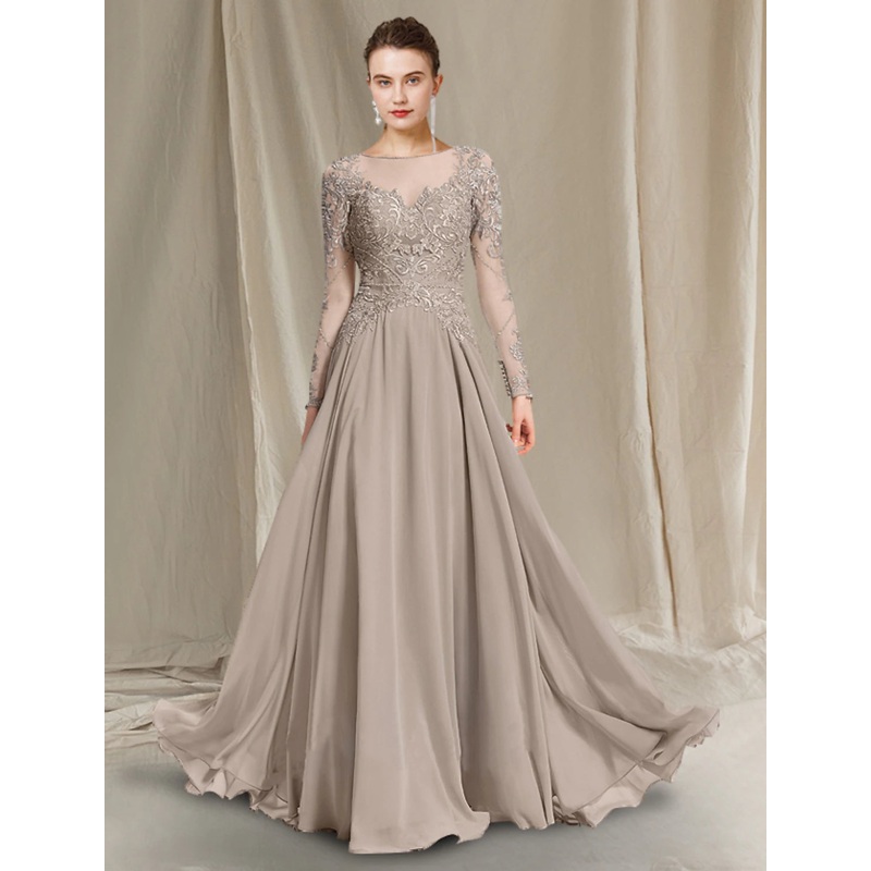 A-Line Mother of the Bride Dress Luxurious Elegant Jewel Neck Floor Length Chiffon Lace Long Sleeve with Pleats Appliques