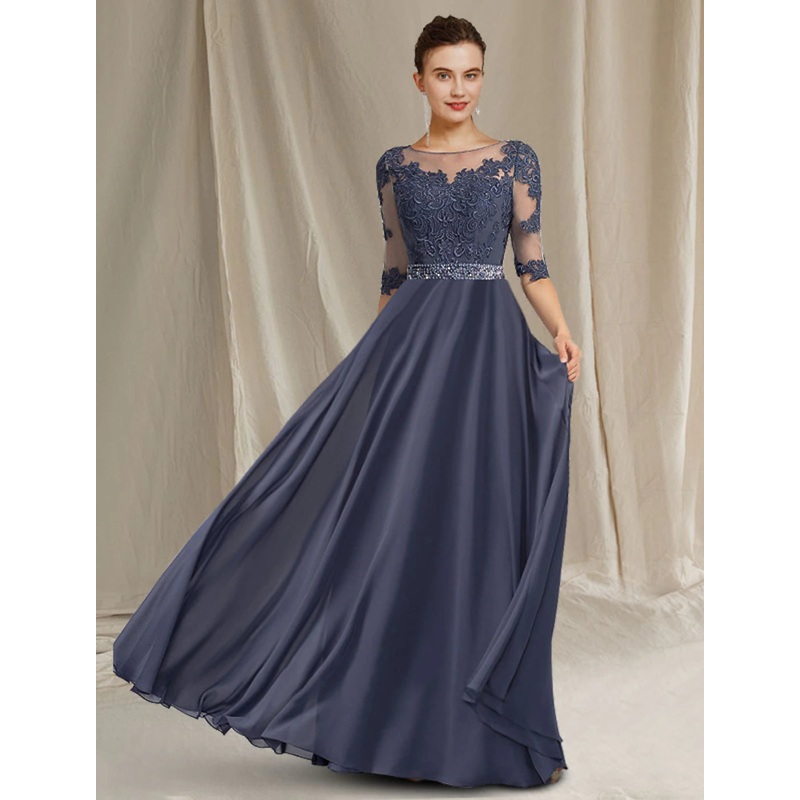 A-Line Mother of the Bride Dress Luxurious Elegant Jewel Neck Floor Length Chiffon Lace Tulle Half Sleeve with Crystals Appliques