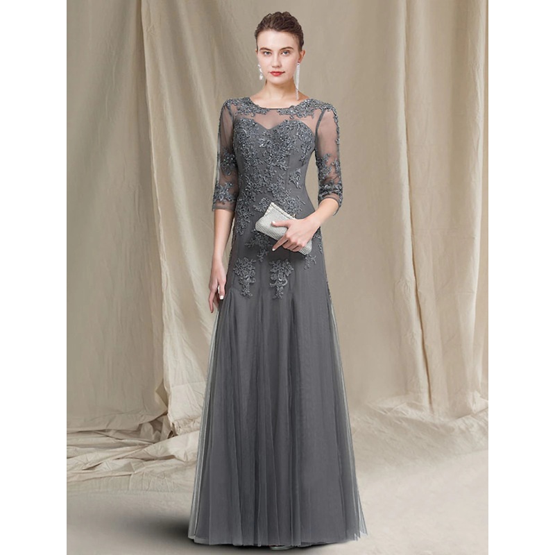 A-Line Mother of the Bride Dress Luxurious Elegant Jewel Neck Floor Length Lace Tulle 3/4 Length Sleeve with Appliques
