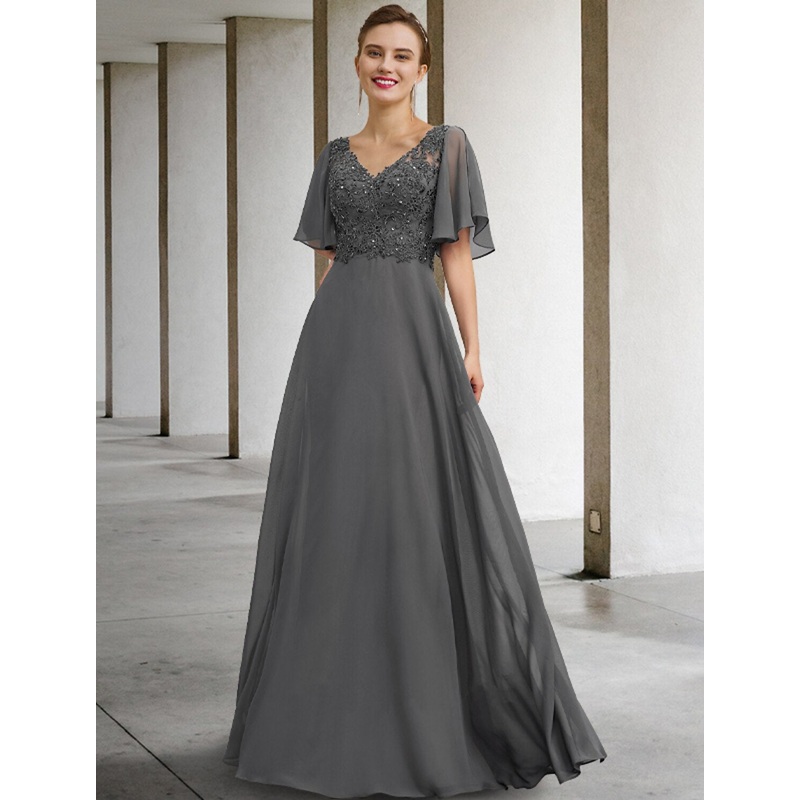 A-Line Mother of the Bride Dress Luxurious Elegant V Neck Floor Length Chiffon Lace Short Sleeve with Beading Appliques