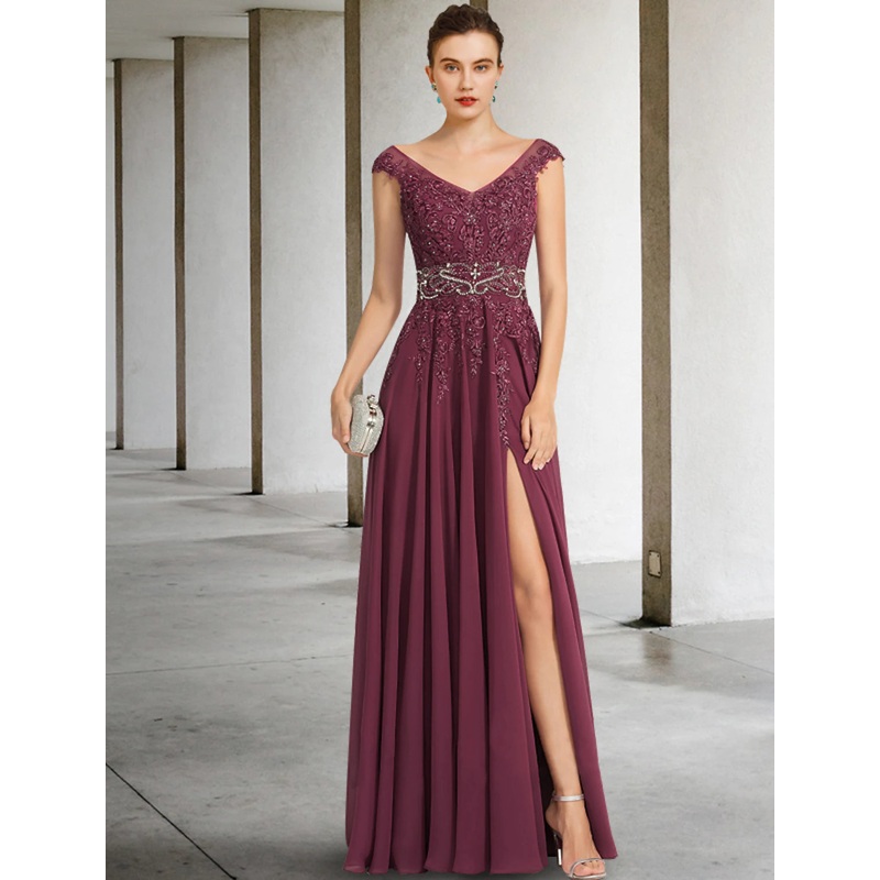 Be the first to review “A-Line Mother of the Bride Dress Luxurious Elegant V Neck Floor Length Chiffon Lace Sleeveless with Sash / Ribbon Beading Split Front” Cancel reply