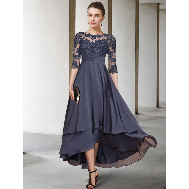 A-Line Mother of the Bride Dress Plus Size Elegant High Low Jewel Neck Asymmetrical Tea Length Chiffon Lace Short Sleeve with Ruched Beading Appliques