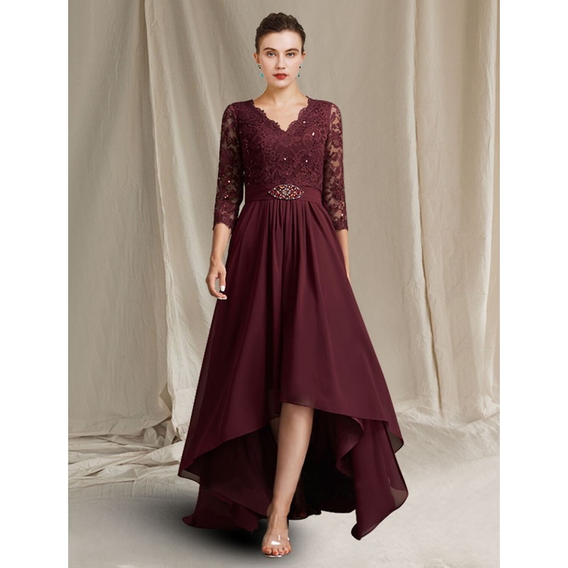 A-Line Mother of the Bride Dress Plus Size Elegant High Low V Neck Asymmetrical Floor Length Chiffon Lace 3/4 Length Sleeve with Pleats Appliques Crystal Brooch