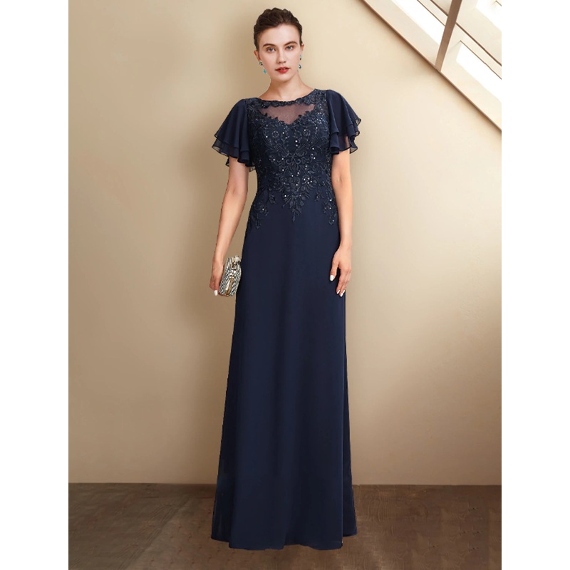 A-Line Mother of the Bride Dress Plus Size Elegant Jewel Neck Floor Length Chiffon Lace Short Sleeve with Sequin Appliques