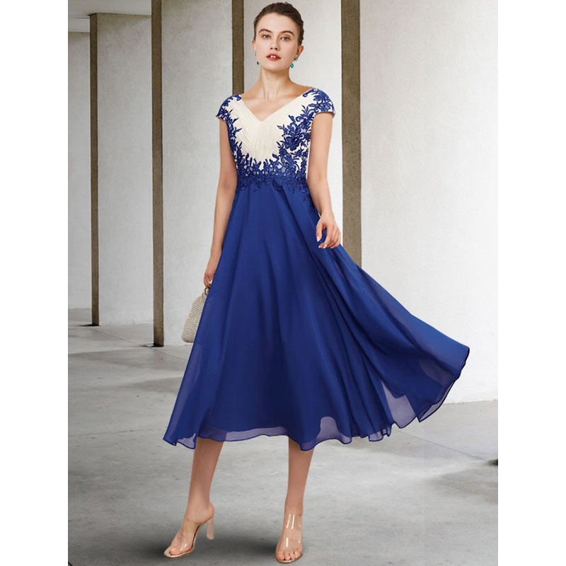 A-Line Mother of the Bride Dress Plus Size Elegant V Neck Tea Length Chiffon Lace Cap Sleeve with Appliques Side-Draped Color Block