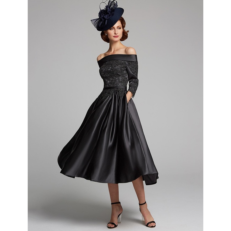A-Line Mother of the Bride Dress Plus Size Sexy Off Shoulder Tea Length Satin Lace 3/4 Length Sleeve with Lace Sash / Ribbon
