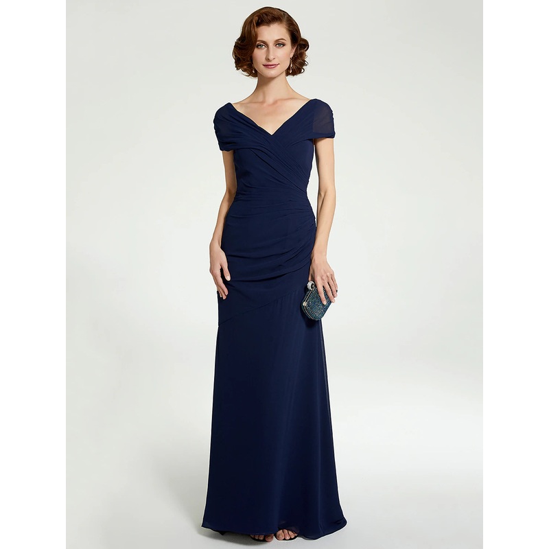 A-Line Mother of the Bride Dress V Neck Floor Length Chiffon Sleeveless with Ruching