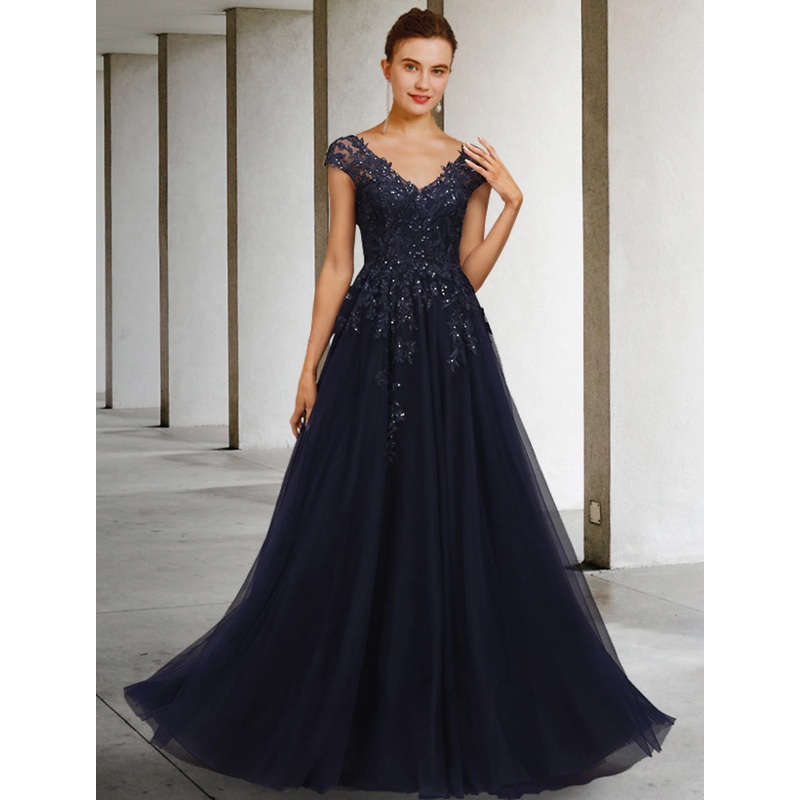A-Line Mother of the Bride Dress Vintage Elegant V Neck Floor Length Tulle Sequined Cap Sleeve with Sequin Appliques